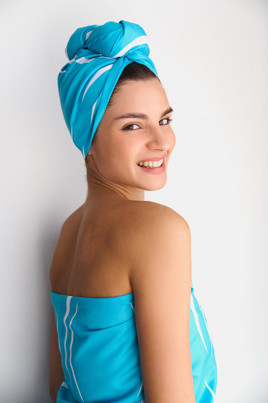 Our set includes a quick-dry towel and matching hair wrap to carry with you wherever you go.